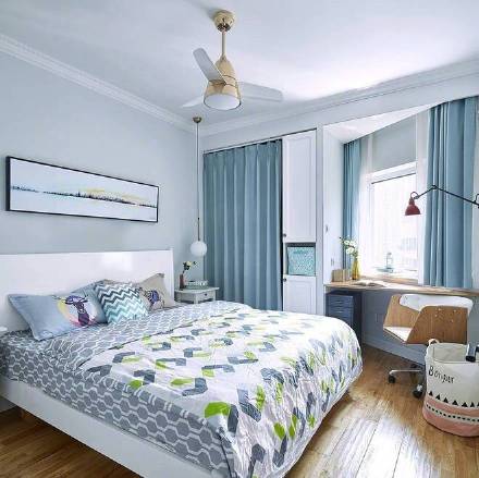 臥室在黑白之外加入了糖果綠,對比強(qiáng)烈的色彩并不會(huì)產(chǎn)生沖突感,而是表現(xiàn)出主人明朗活躍的個(gè)性。靠窗的書桌,彌補(bǔ)了沒有陽臺(tái)的缺陷,靜聽雨聲,想來也是不錯(cuò)的體驗(yàn)。